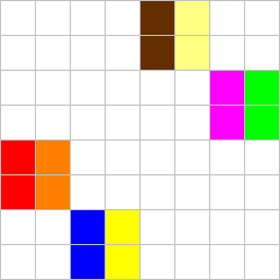 If you refer back to p3, " - red squares are mirrored by green; orange by purple; blue by cream; brown by yellow," - this is what, again, we have. A final reduction? As per p9, each house is associated with a compass point. Introduce them and the above becomes -