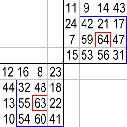 This seemingly random (chaotic?) group of numbers changes when the 8x8 square is divided into four quadrants - Q1, Q11, Q2, Q12 -