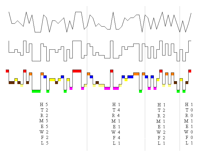 The top four lines have 5E to 3H; the bottom four 5H to 3E. Scanning the columns from left to right, the first four have 5H to 3E, the second four 5E to 3H. Q1 and Q2 mirror one another, to a pattern of 8H/8E. Q3 and Q4 also ‘mirror’ one another, but the groupings are 12E/4H and 12H/4E.