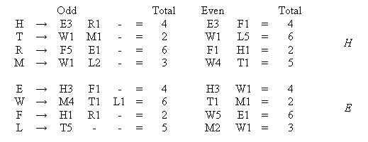 We see that H is an odd number four times (with E - 1, 23, 33; with R - 35); and four times an even number (with E - 12, 20 44; with F - 14). For all houses we have -