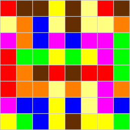 If you refer back to p3, " - red squares are mirrored by green; orange by purple; blue by cream; brown by yellow," - this is what, again, we have. A final reduction? As per p9, each house is associated with a compass point. Introduce them and the above becomes -