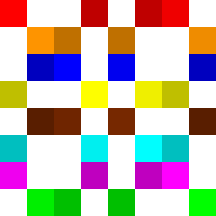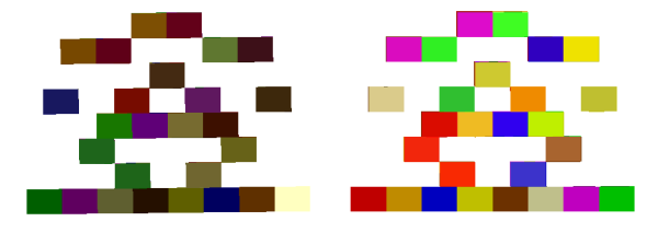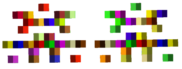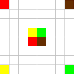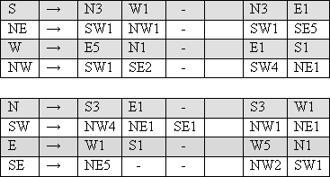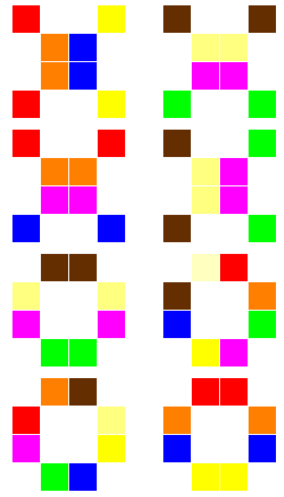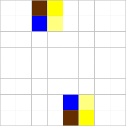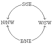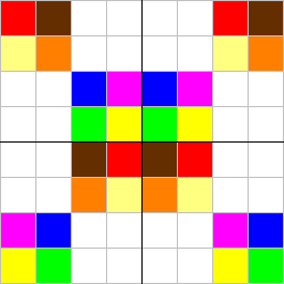 If you refer back to p3, " - red squares are mirrored by green; orange by purple; blue by cream; brown by yellow," - this is what, again, we have. A final reduction? As per p9, each house is associated with a compass point. Introduce them and the above becomes -
