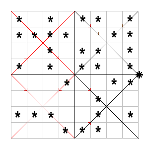 - cardinal compass points are paired only with other cardinal points; secondary points with secondary points - including the ‘disturbed’ pairings of Wind and Fire. It seems there is nothing at all random about the ‘standard layout’ - I assume the few instances of ‘disturbed equilibrium’ which do occur, such as the pairings of Wind (SW) and Lake (SE), are absolutely deliberate, an essential part of some overall pattern - if there were no ‘disturbance’ the layout would be stable/static - a notion completely at odds with the I Ching – “Rest is merely a state of polarity that always posits movement as its complement.- We would have entropy. In the following diagram, ‘stars’ indicate the location of the ‘odd numbers’ in the standard layout.