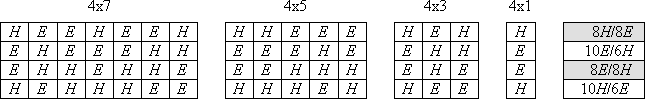 The top four lines have 5E to 3H; the bottom four 5H to 3E. Scanning the columns from left to right, the first four have 5H to 3E, the second four 5E to 3H. Q1 and Q2 mirror one another, to a pattern of 8H/8E. Q3 and Q4 also ‘mirror’ one another, but the groupings are 12E/4H and 12H/4E.