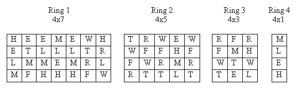 I see no visual pattern - tho’ I can easily imagine one or two staring me. But there is a numeric pattern - Q12 has five odd numbers, Q2 has seven, Q1 has nine, and Q11 has eleven. Add the diagonals and you total 16 = 1+6 = 7 Gazing at it, I can imagine I am looking at an ancient sky chart - here, the Big Dipper; there, the North Star. Maybe somewhere a buried treasure - an unknown planet? The following patterns emerge when we turn the standard layout into a series of rings - or as a spiral -going from the outer to the inner. Ring 1 has twenty-eight squares (4x7); ring 2 has twenty (4x5); ring 3 twelve (4x3); ring four, (4x1). Going clockwise from top left, spiralling in to the centre, the following is the result -