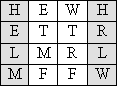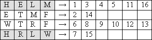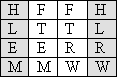 The letters H, E, L, etc refer to the houses. Scan the columns, you have again, only four groups - configurations vary, but the same forces are always together. In order of appearance -